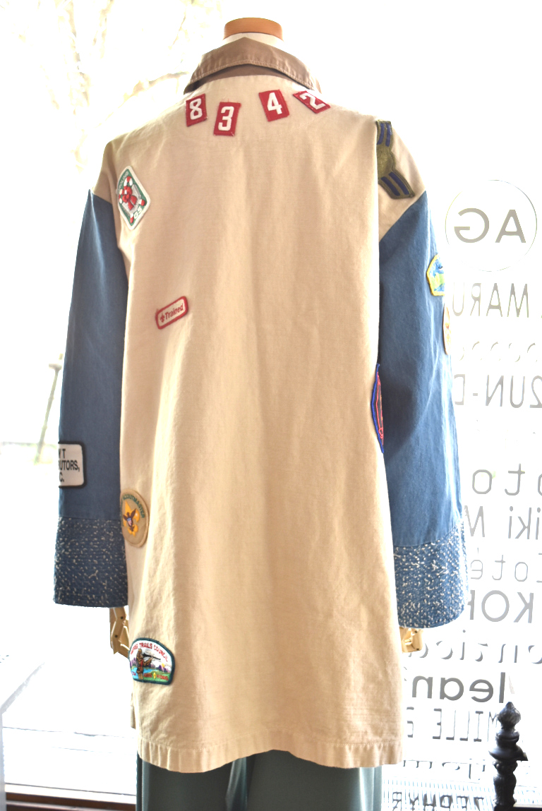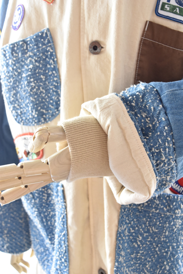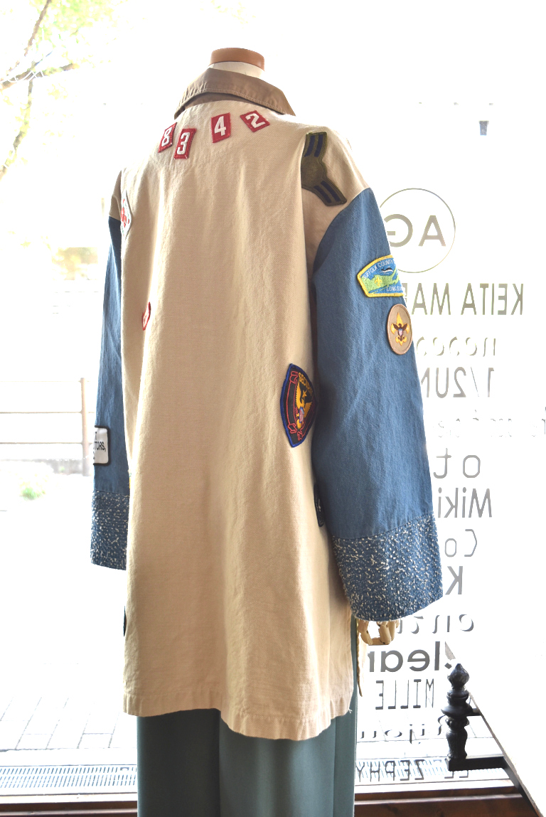 全体に色のトーンを合わせるためにベージュにオーバーダイ(染め直し)をして、更にVINTAGE感を出す為にシリコン柔軟加工(生地がクタクタになる加工)を施しています。