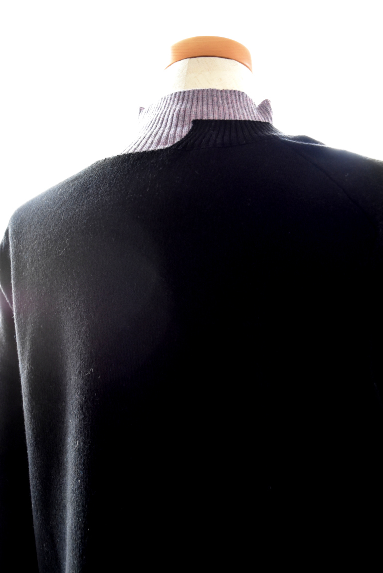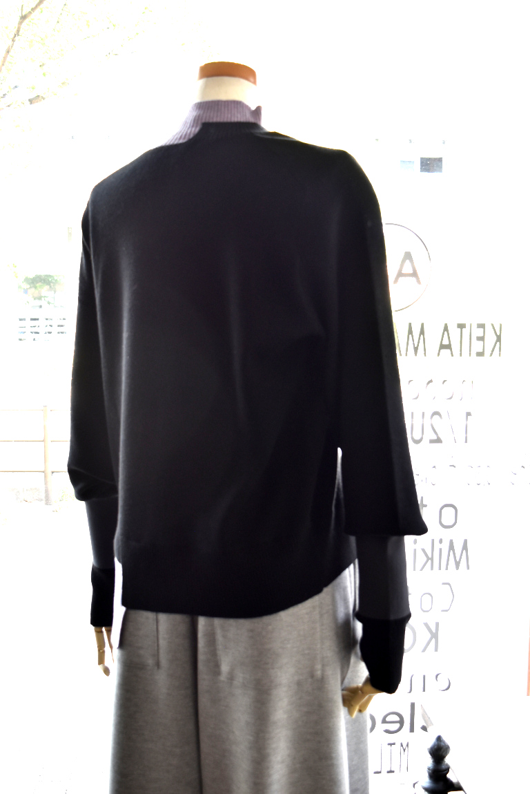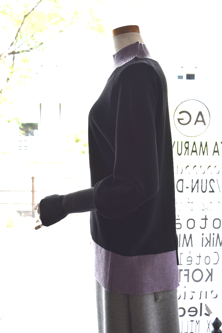印象的なネックはレイヤード風のダブルカラーデザイン。裾もアシンメトリーにデザインすることで、1枚で着た時も軽装に見えずインナーとして着用時にはアウターからのぞく首元のバイカラーが違いを感じさせるアクセントとなります。