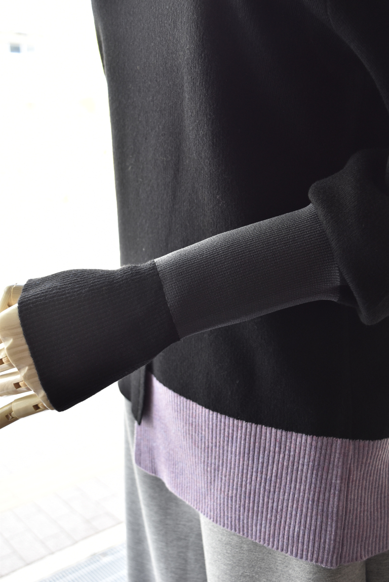 袖のバイカラー部分はリブ編みで袖を上げるブラウジングにも役立ち、スタイルに合わせて折り返すことで配色の印象を控えることもできます。