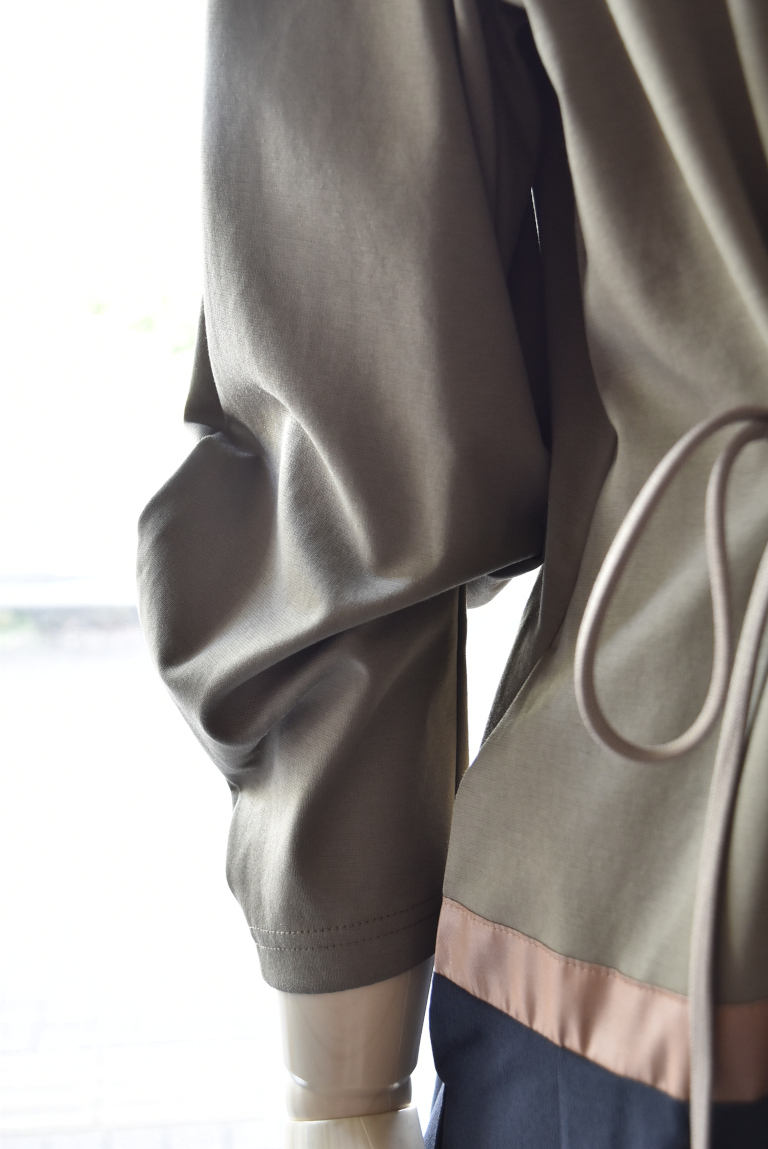 袖はアームホールがやや落ちたゆったりとカーブする8分袖。