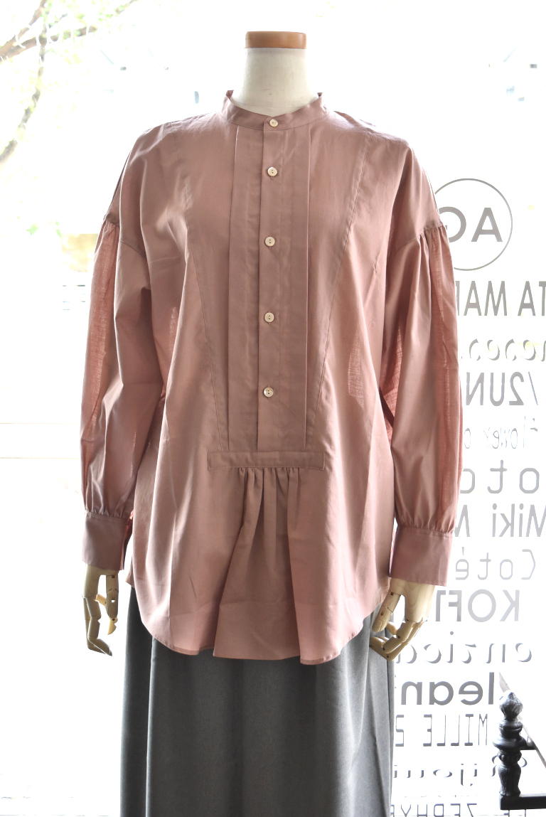 ゆったりとした身幅と程よい着丈が体のラインもカバーし、タックの装飾が入った胸当てなどのヴィンテージシャツに見られるディテールがクラシカルな雰囲気を演出。