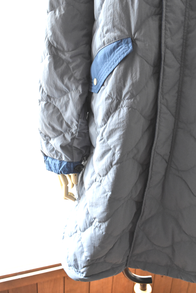 パウダリータッチの軽量ナイロン素材にダウンパックを挟み、サンドイッチ状にキルト加工を施しています。