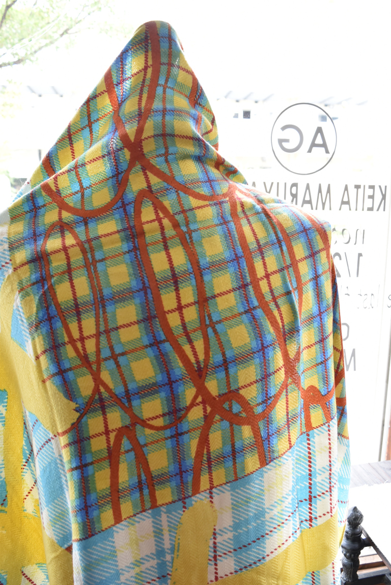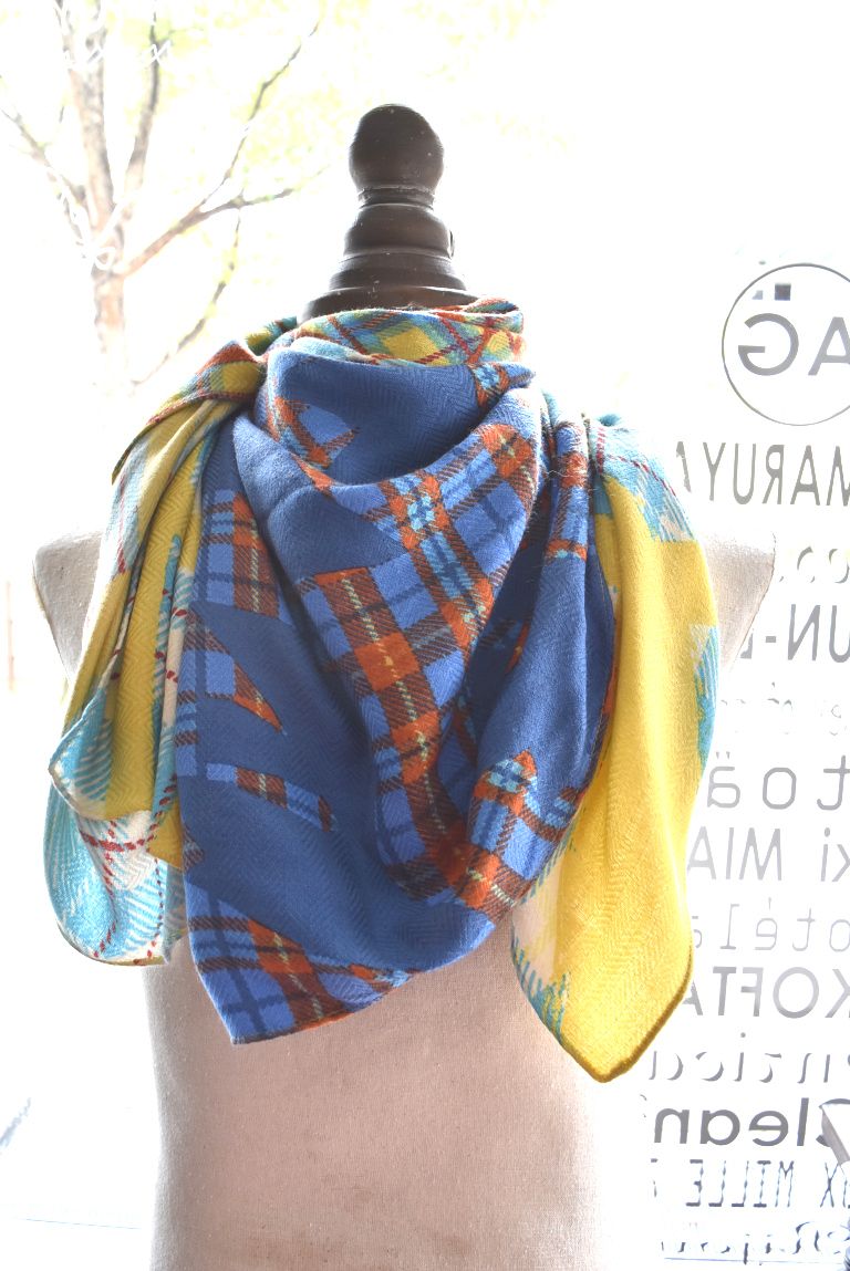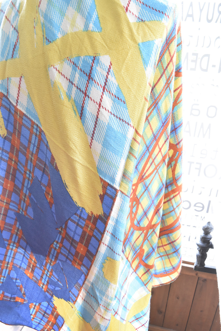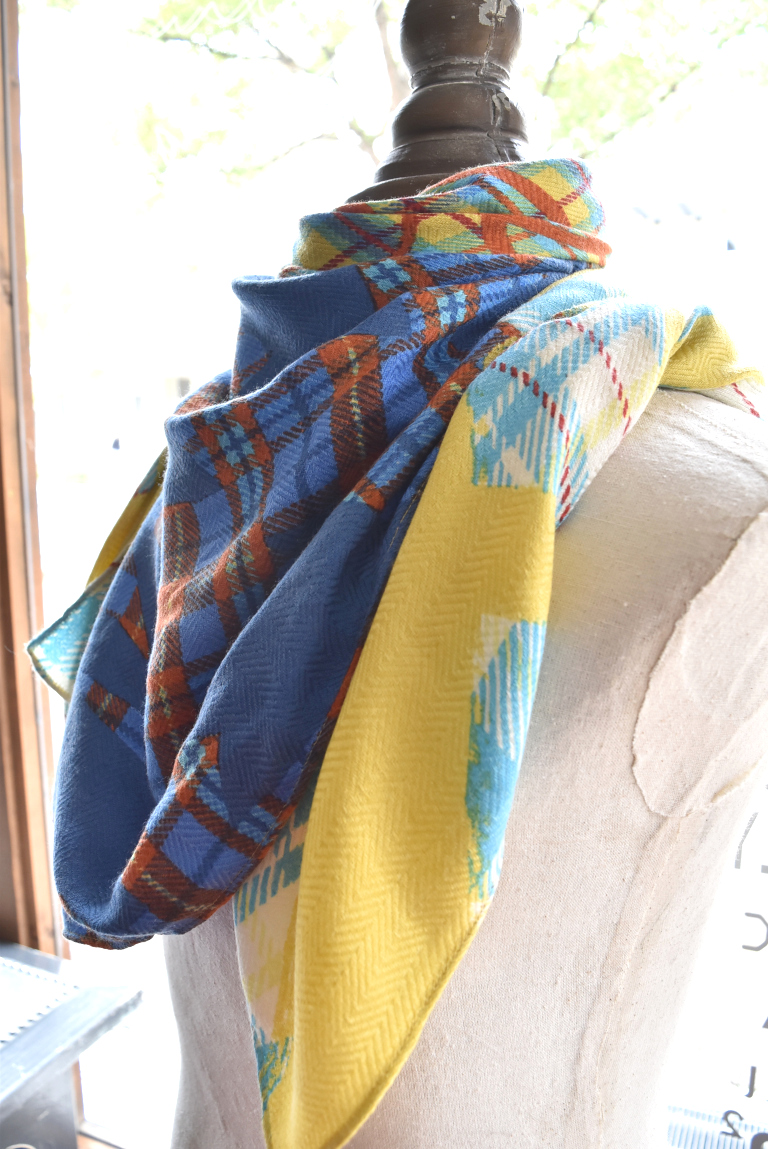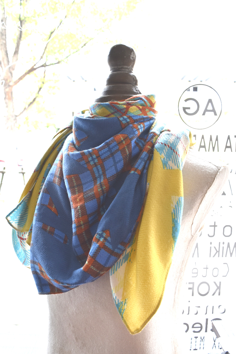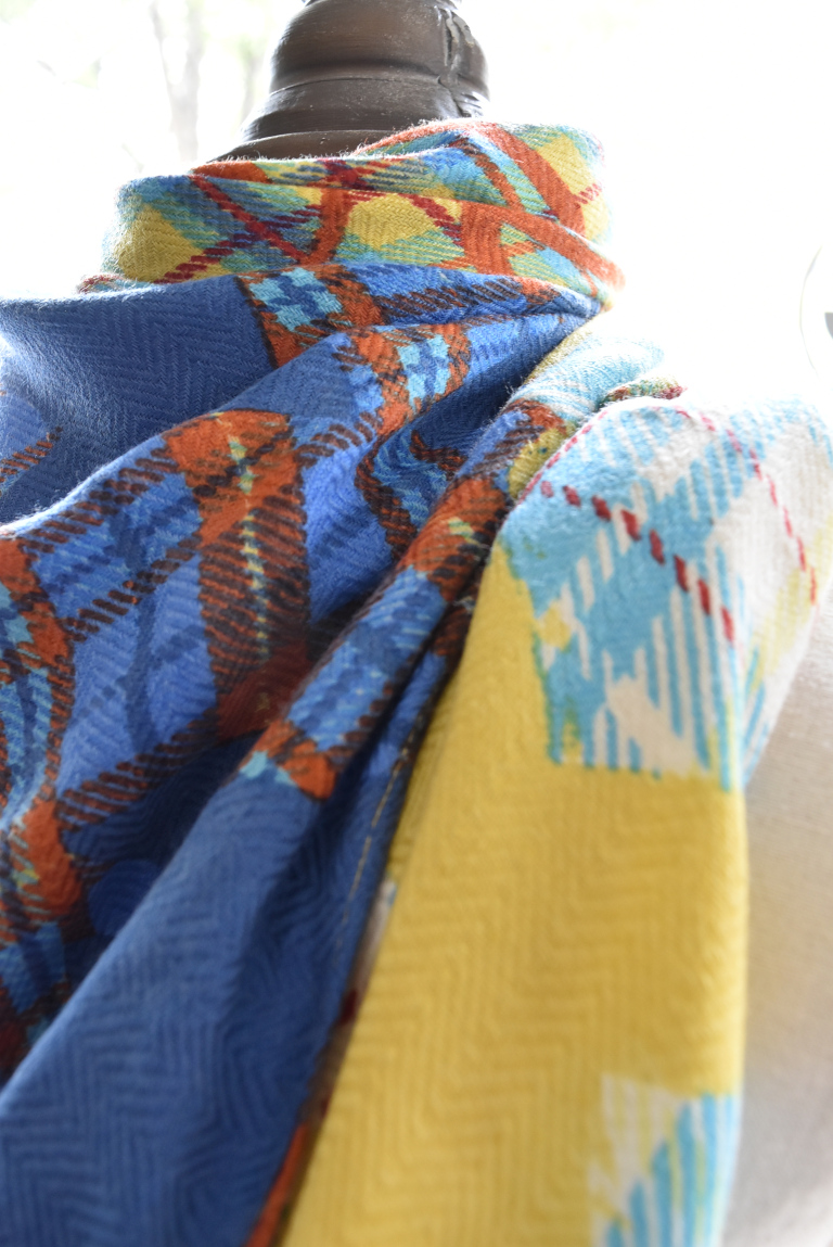 ヘリンボーン地にmanipuriのスカーフ柄がプリントされた色鮮やかなストール。
