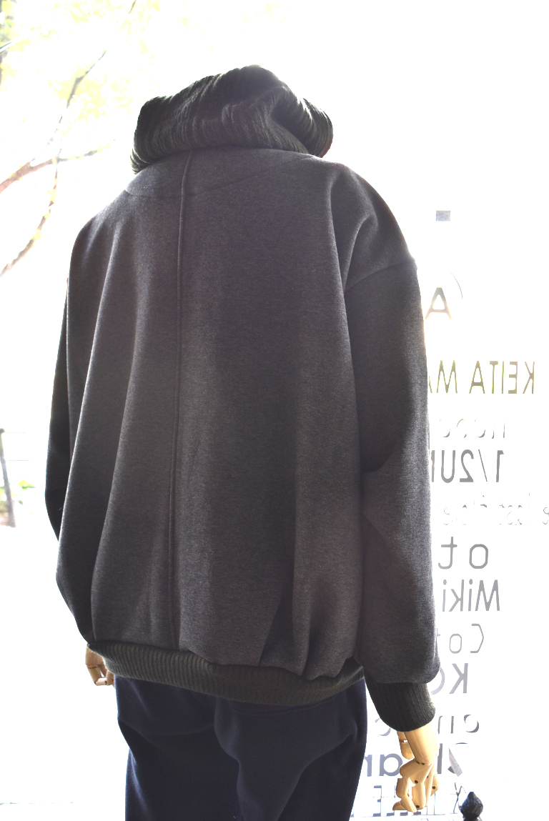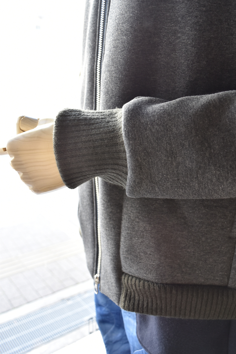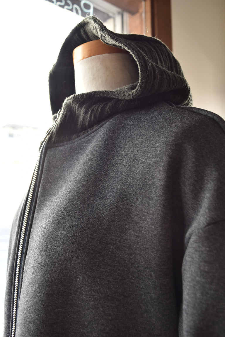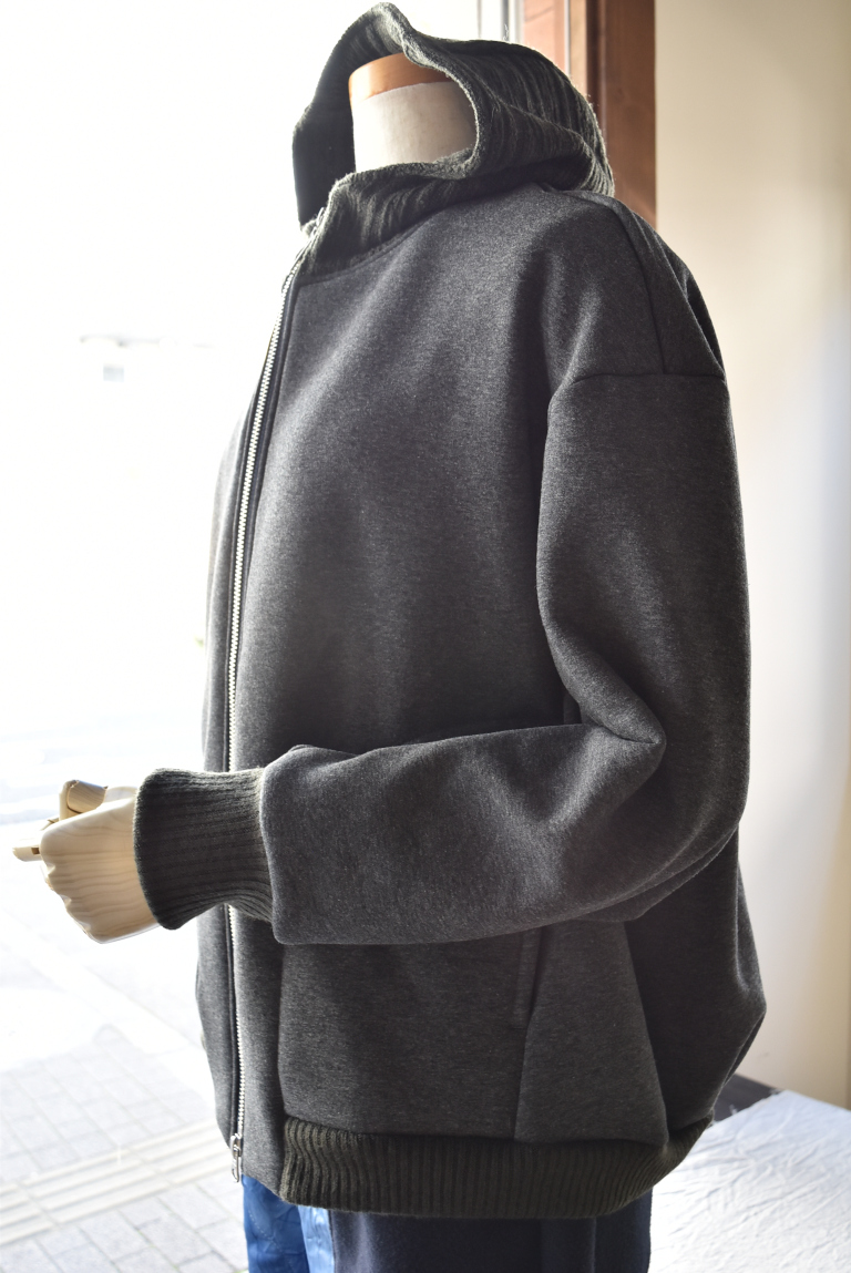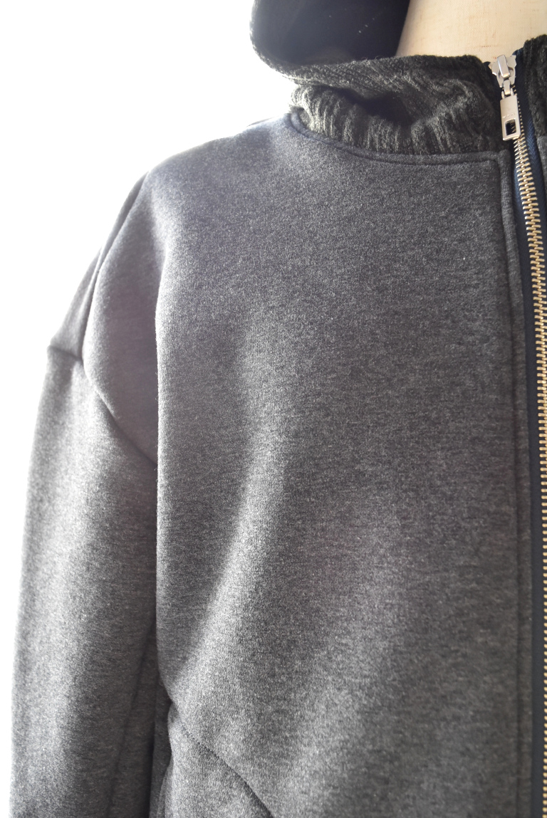 フード部分にはケーブル柄のセーターライクなジャージー素材を使用。