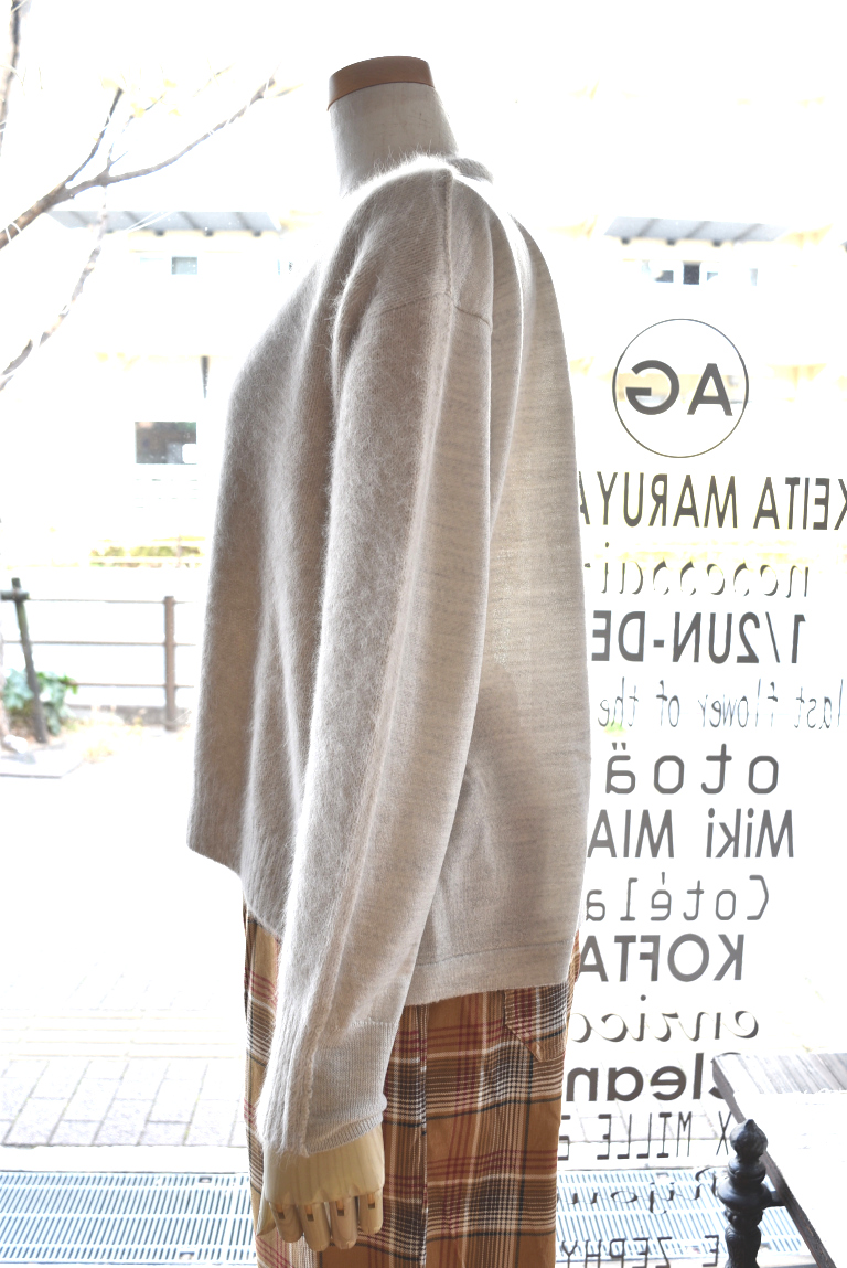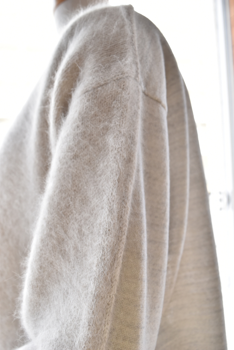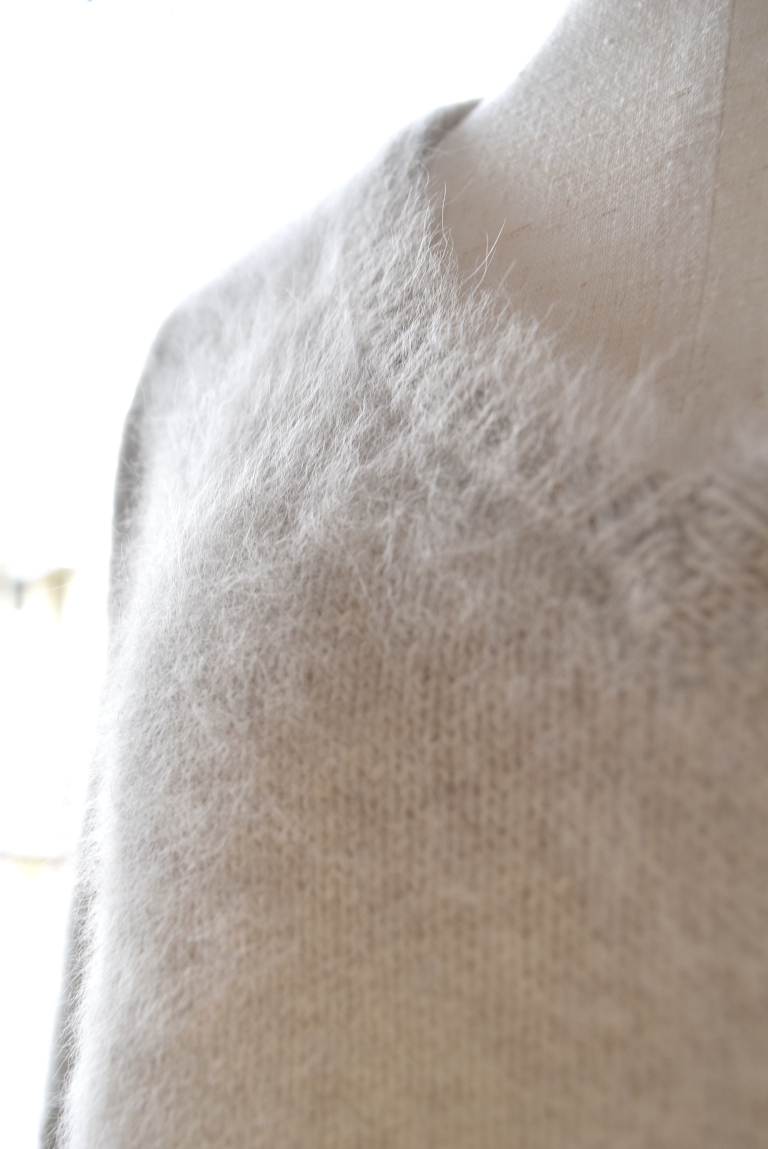 ブラッシングすることで採れたフォックスの毛と、カシミヤを混紡したふわふわの素材感がどても心地よい、軽くて暖かい新素材を前身頃に使用しています。
