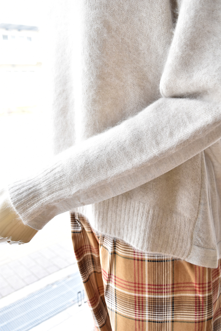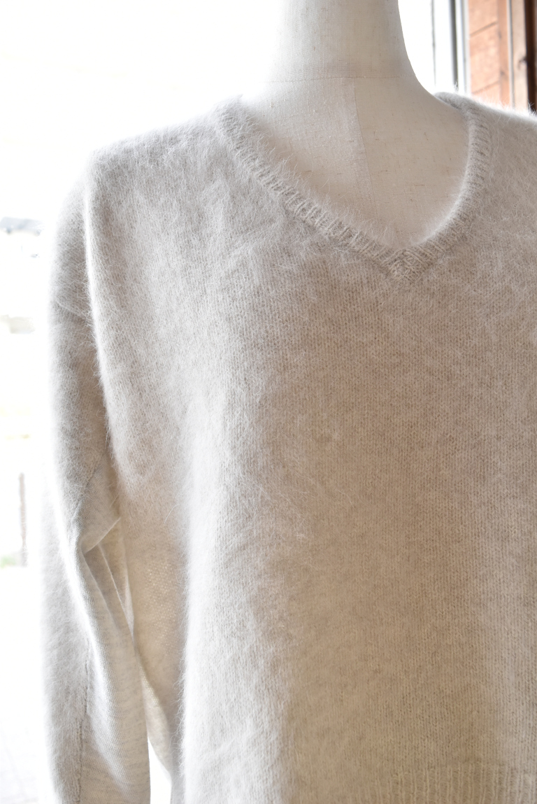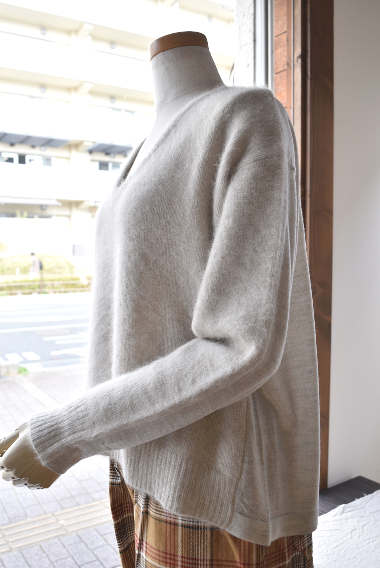繊細な起毛感と柔らかな肌触りが魅力のVネックニット。
