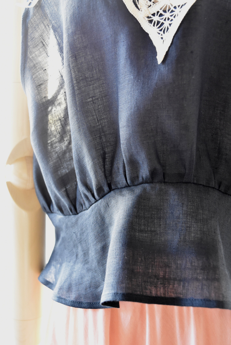 ペプラムのシルエットが可愛く、後ろ身頃も紐でお好きなカタチにして絞って着て頂けます。