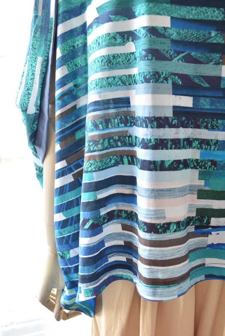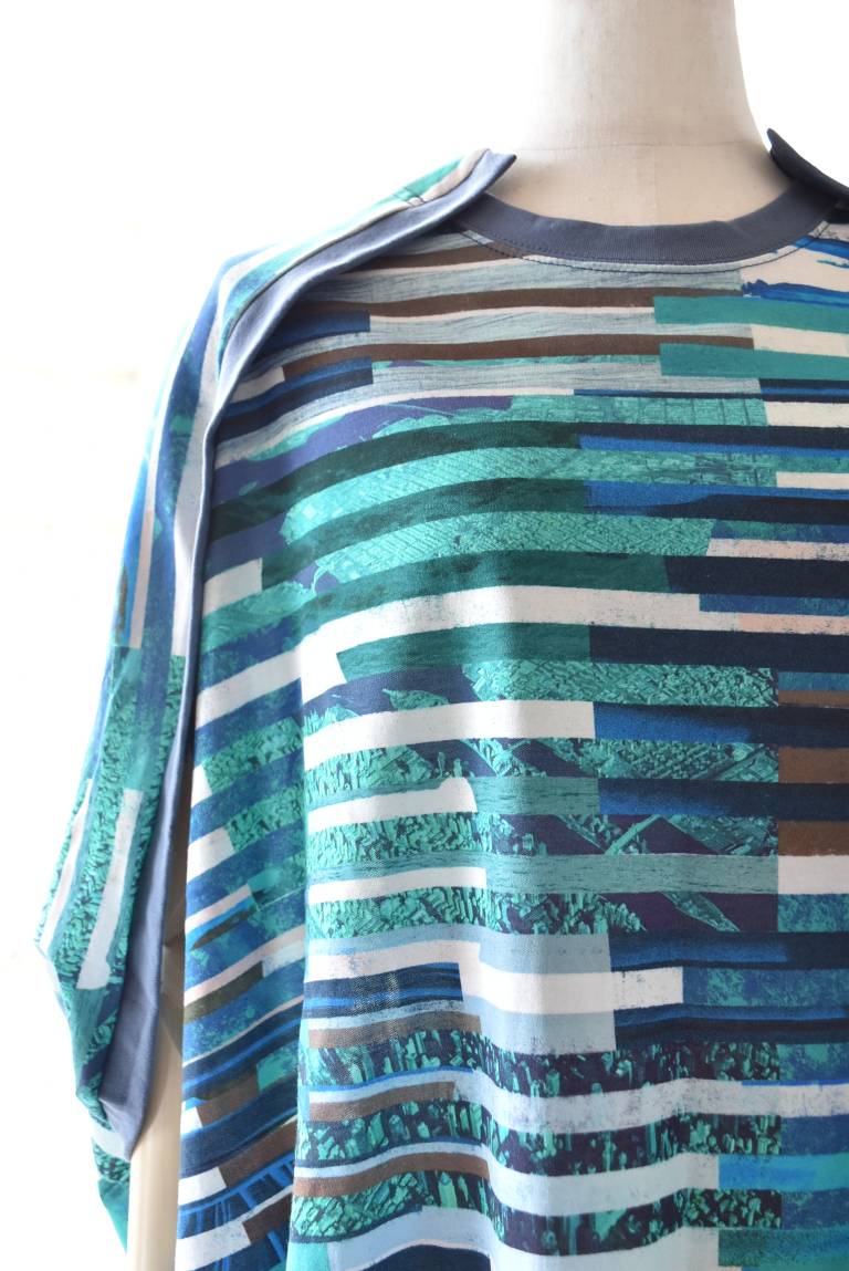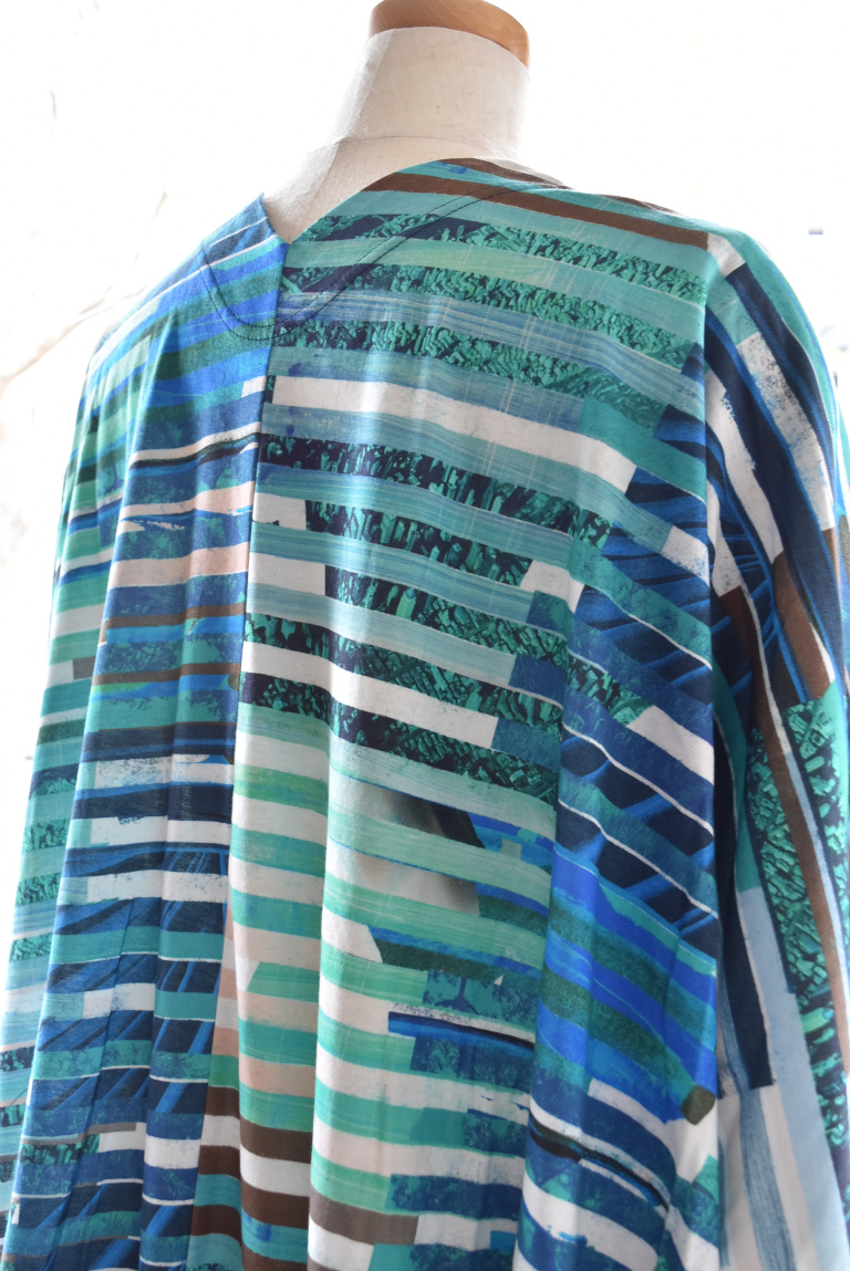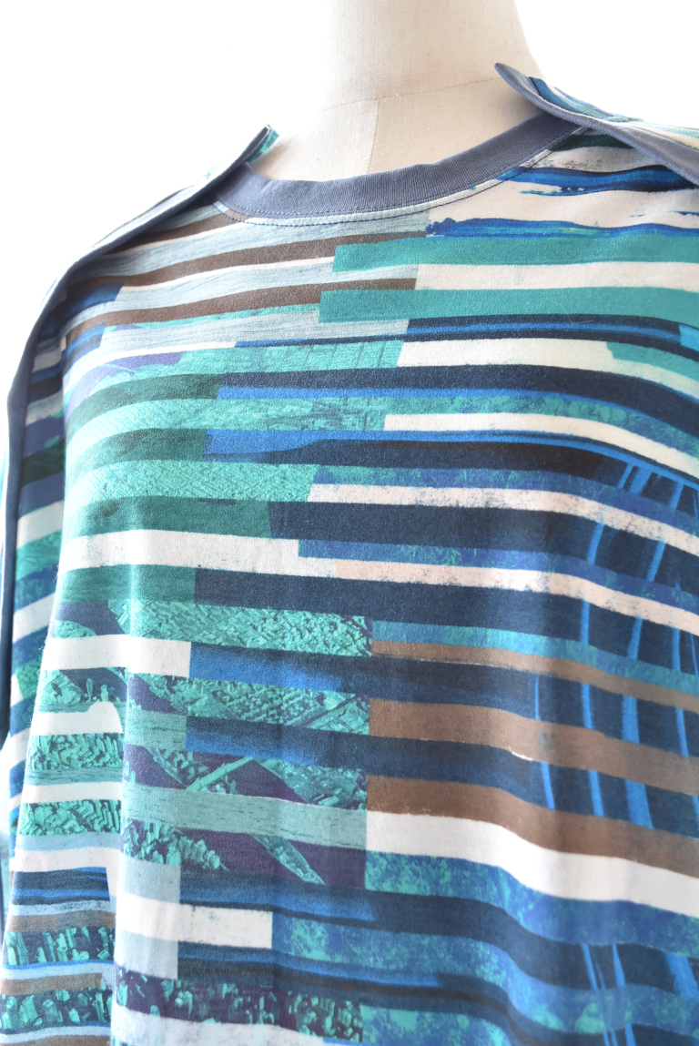 複数のイメージを短冊状に切り取り、断片的に再構成したコラージュプリントは、視覚的なリズムと奥行きを生み出し、動きに合わせて多様な表情を見せます。