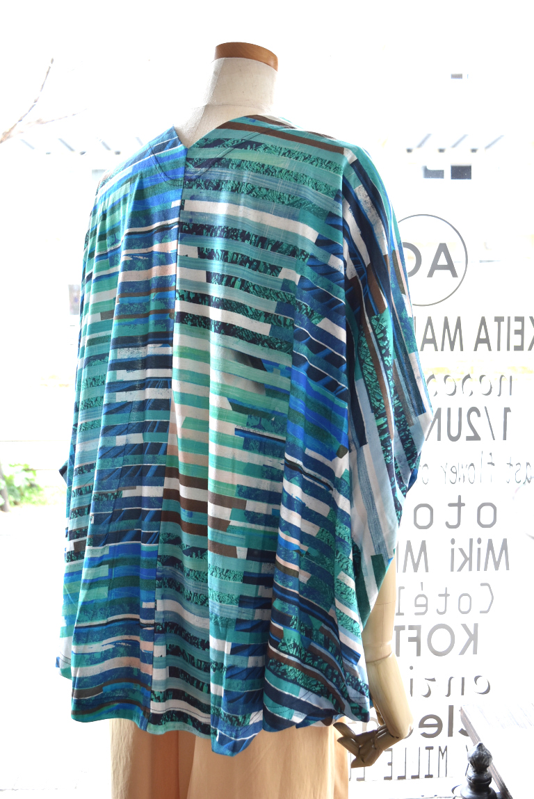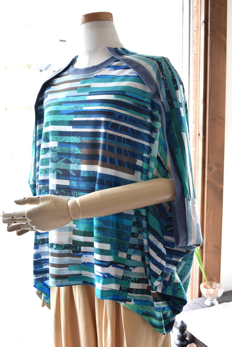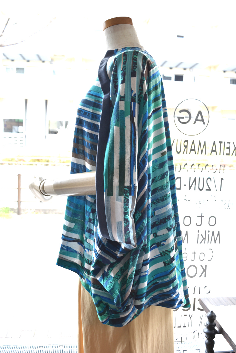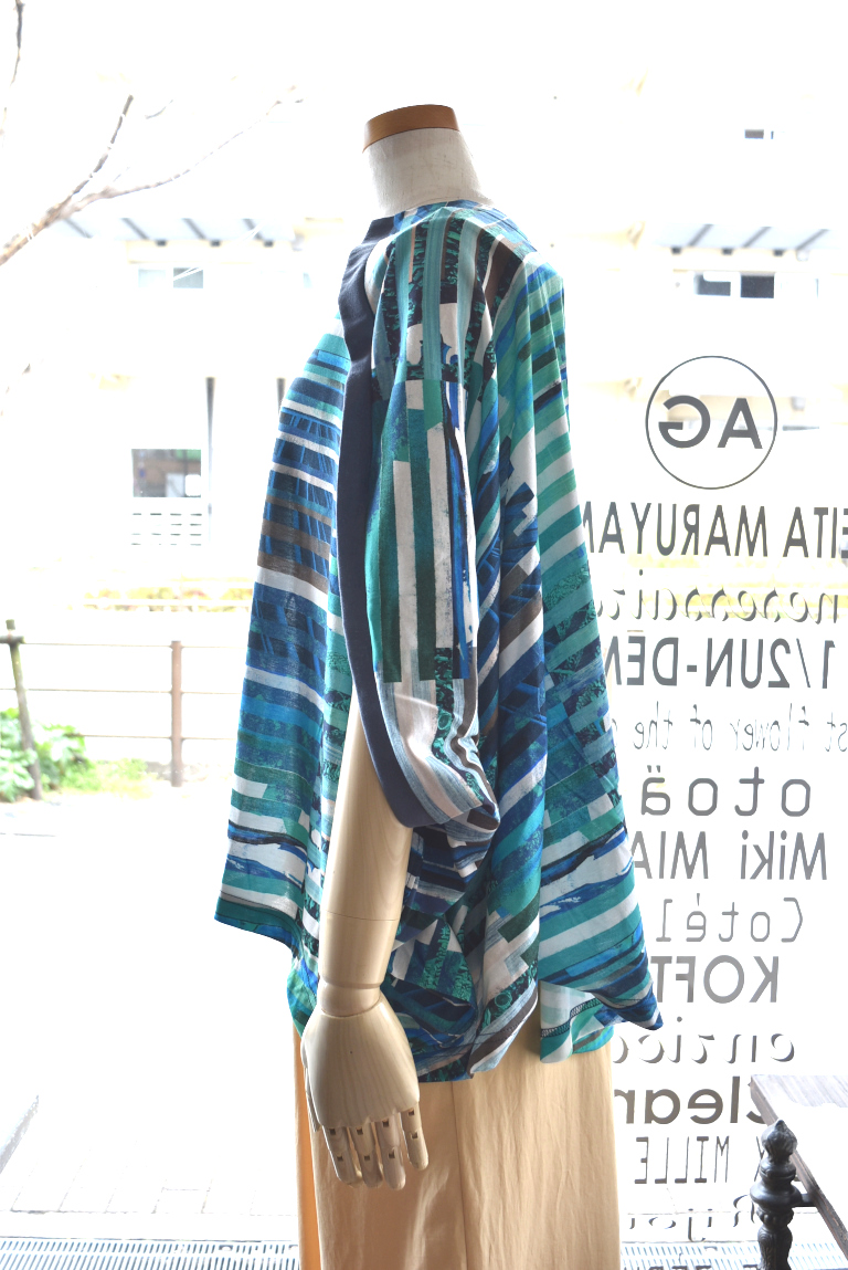 複数のイメージを短冊状に切り取り、断片的に再構成したコラージュプリントは、視覚的なリズムと奥行きを生み出し、動きに合わせて多様な表情を見せます。