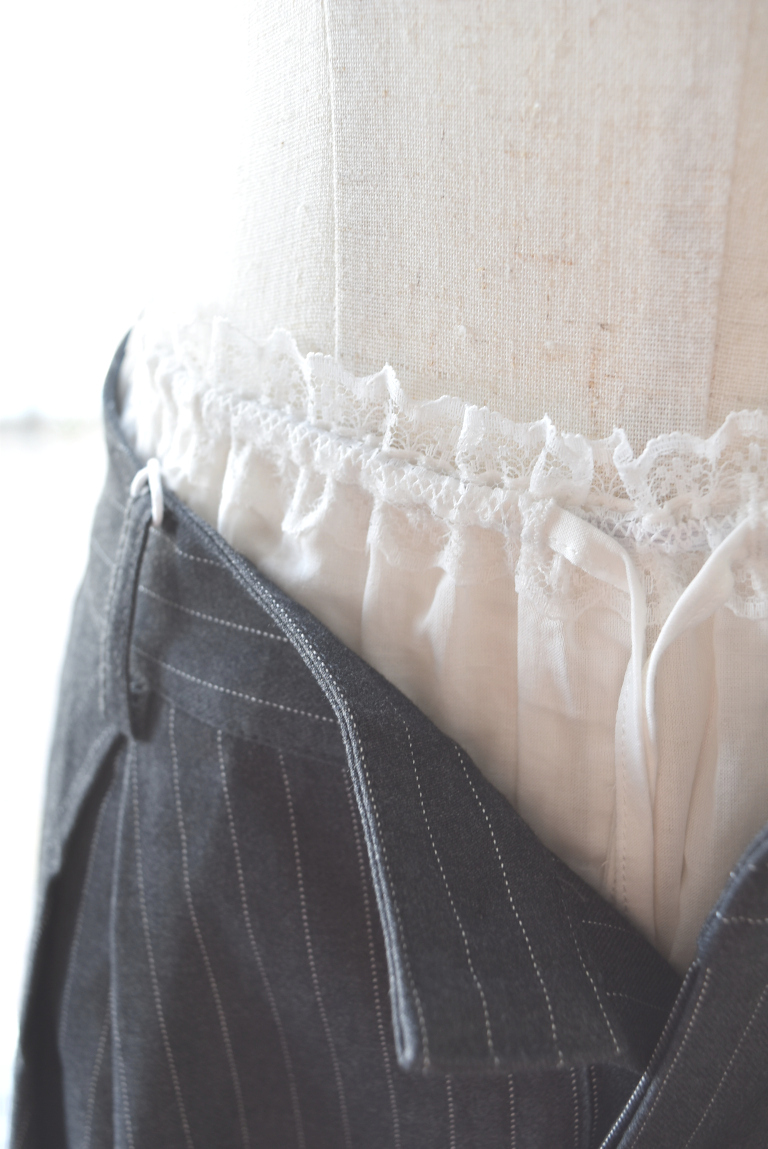 ウエストには繊細なレーステープをあしらい、動きの中でさりげなく覗くレースがフェミニンなアクセントに。