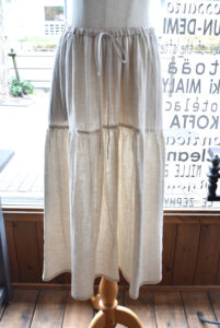 ダブルガーゼ 2026年2月21日 Filed under: admin ティアードスカートです。 KOFTA Linen W Gauze ティアードスカート カラーは、Kinariになります。 内側はコットン、外側はリネンのWガーゼになっています。 肌当たりがとても気持ちがいいスカートです。 ウエストは総ゴム仕様♪